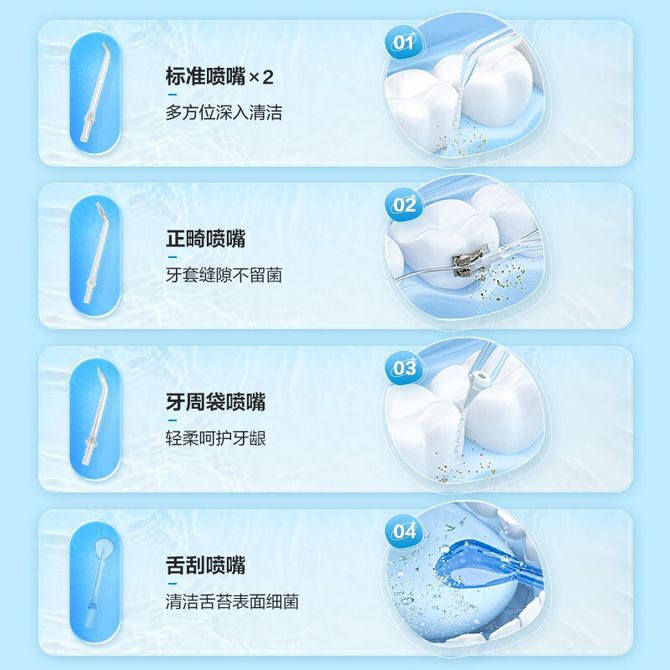 美的(Midea)冲牙器 洗牙器水牙线洗牙洁牙器 小蓝鲸冲牙器 MC-BJ0101银白色 专利重力球设计 60天长续航 兑换价格 10400 里程 会员卡别 终身白金卡 白金卡 金卡 银卡 普通卡 儿童卡 服务 由 观脂电器 发货并提供售后 颜色: 银色 购买数量: 件 库存件 配送地址: 立即购买 加入购物车 成功添加到购物车 关闭 购物车共有 种商品 总金额为: 组合销售 产品介绍 产品规格 售后服务 产品咨询 发现好货 小米 声波电动牙刷家用男女高频振动充电式防水牙刷 T300标准版 4400 里程 飞利浦/Philips 电动牙刷头HX9021适配HX6511/HX6730/HX6761/HX3226/ 2400 里程 小米 米家声波电动牙刷 声波洁牙柔感护龈 超长续航 T200蓝色 4400 里程 小米 声波电动牙刷家用电牙刷男女士牙刷高频振动充电式防水牙刷牙齿清洁 4400 里程 米家 电动冲牙器 白色 200mL大容量水箱 4挡模式附带模式记忆功能 9700 里程