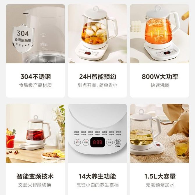 组合销售 产品介绍 产品规格 售后服务 产品咨询 发现好货 九阳/Joyoung 养生壶1.5L茶具电茶壶煮茶壶花茶壶玻璃煮茶器煎药壶中药锅药膳电水壶烧水壶 3900 里程 九阳/Joyoung 养生壶迷你玻璃花茶壶煮茶器 12大功能11档温度 电水壶热水壶烧水壶 1.5L DGD1506BQ 3900 里程 美的/Midea 养生壶 1.5L家用多功能小型全自动办公室烧水壶加厚玻璃煮茶热水壶 MK-YS15P201 4200 里程 美的/Midea 养生壶 1.5L家用养生壶全自动玻璃烧水壶24h预约烧水壶12小时防干烧保护智能恒温 MK-YS15P202 3700 里程 美的/Midea 养生壶 1.5L全自动电热水壶 24h预约12小时智能恒温 14大功能11档控温 花茶壶煮茶器MK-Y12Q 3500 里程
