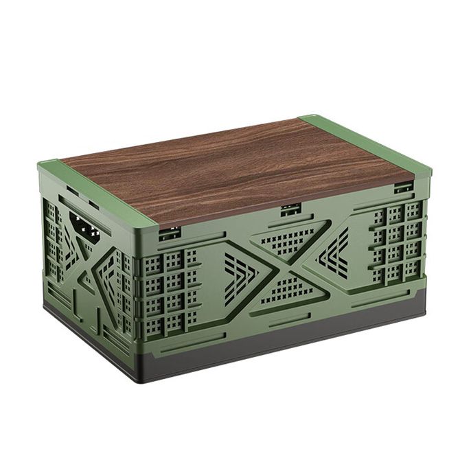 悦卡后备箱收纳箱车载储物箱可折叠户外露营置物箱周转筐收纳筐镂空胶框日式折叠篮木盖大号-悦卡镂空折叠储物箱大号-绿色(木盖款)
