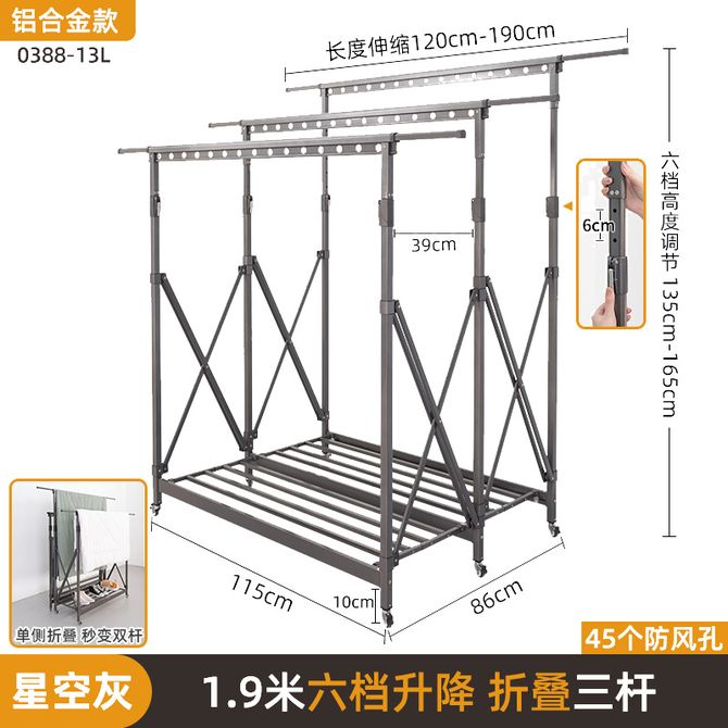 友利特 晾衣架落地折叠铝合金伸缩晾衣杆家用凉衣架室外防风晒被子神器1.9米三杆48孔 高度可升降 星空灰 0388-13L 1.9米三杆48孔 高度可升降 星空灰 0388-13L 兑换价格 34400 里程 会员卡别 终身白金卡 白金卡 金卡 银卡 普通卡 儿童卡 服务 由 赛丹孚家居家装专营店 发货并提供售后 颜色: 其他 购买数量: 件 库存件 配送地址: 立即购买 加入购物车 成功添加到购物车 关闭 购物车共有 种商品 总金额为: