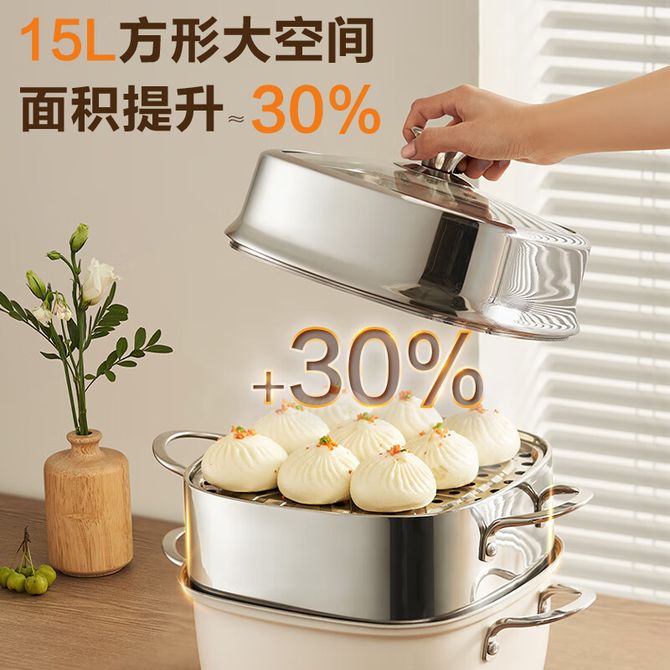 苏泊尔(SUPOR) 方形蒸锅15L大容量 蒸锅304不锈钢巧易取双层蒸煮多用锅EZ24FAS01-W