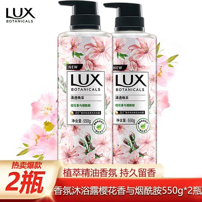 力士/LUX 植萃精油香氛沐浴露 550g*2瓶 共2.2斤 樱花香与烟酰胺 清透焕采植萃系列含高纯度烟酰胺沐浴露家用沐浴液 两瓶装
