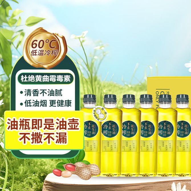 (冷榨花生油500ml*6)216°高烟点,炒菜不呛更健康;冷榨食用油,炒菜自然清香;60°低温压榨,营养保留更完整;5层过滤更纯净,炒菜不呛;清新可凉拌,适合国人体质,煎炒烹炸皆可