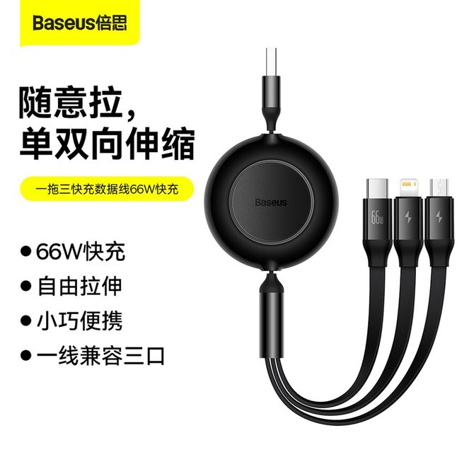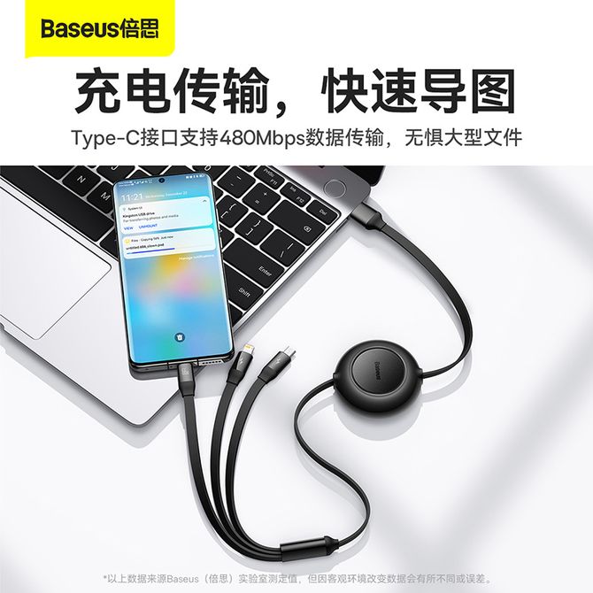 倍思(BASEUS) 明镜系列2 随意拉伸一拖三快充数据线USB to M+L+C 3.5A 1.1m (三色可选)
