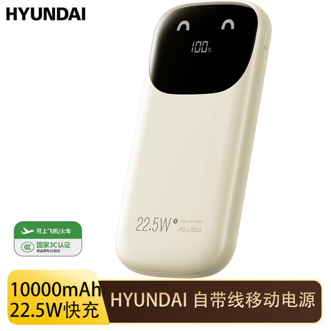 HYUNDAI 10000毫安时充电宝自带线22.5W超级快充移动电源轻薄便 YH-P018