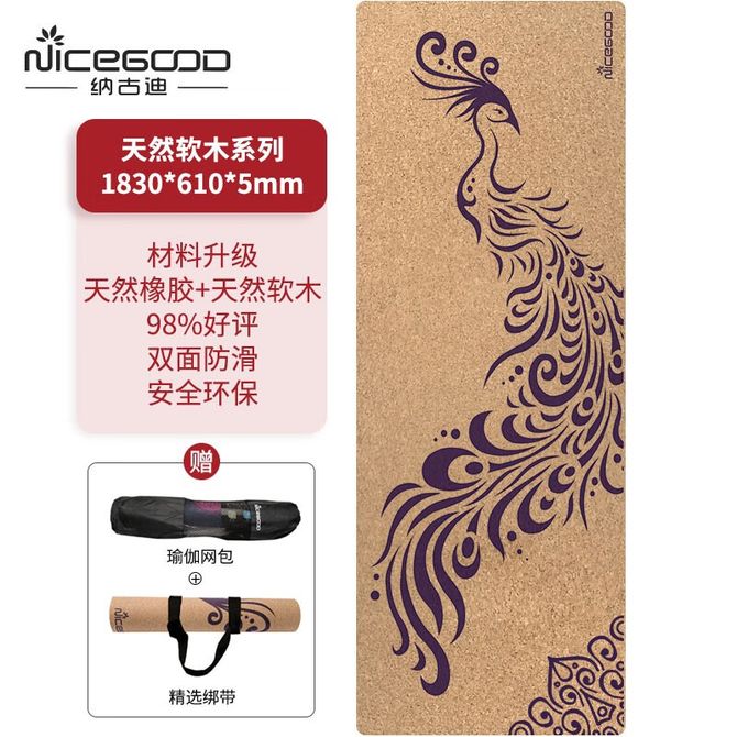 纳古迪(NiceGood) 软木瑜伽垫女初学者加宽5mm厚吸汗防滑天然橡胶运动健身运动垫子 孔雀南飞