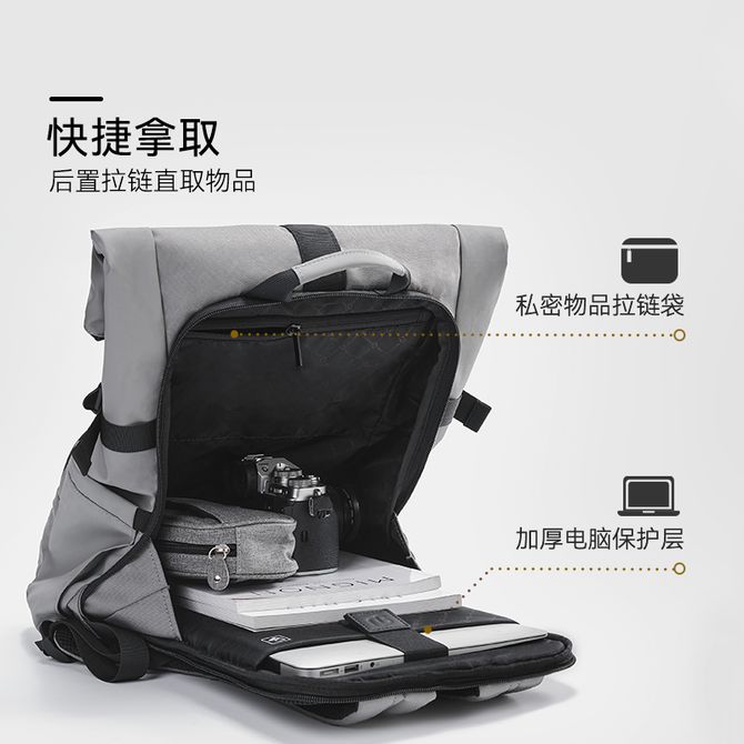 卷口设计 主仓灵活扩容 快捷拿取 后置拉链直取物品 多个小仓位 更多灵活收纳空间