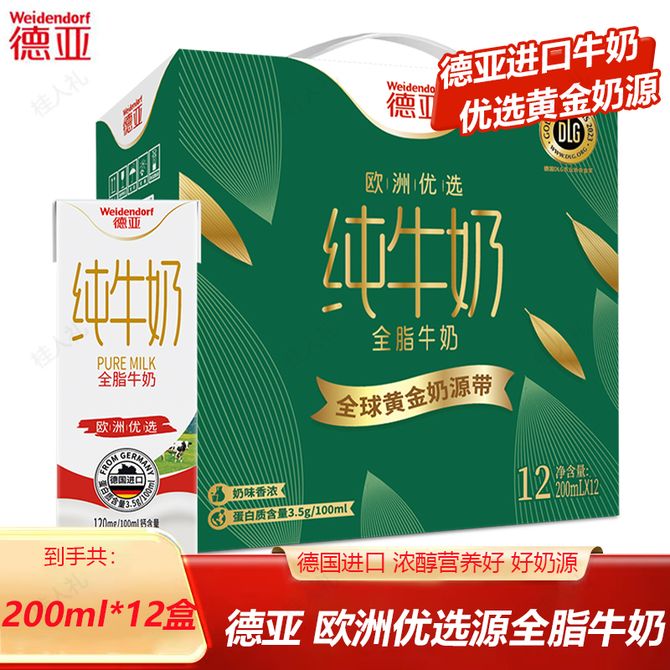 德亚 欧洲优选(黄金奶源带)全脂牛奶200ml*12盒 全脂超高温灭菌 学生中老年人营养早餐牛奶 礼盒装