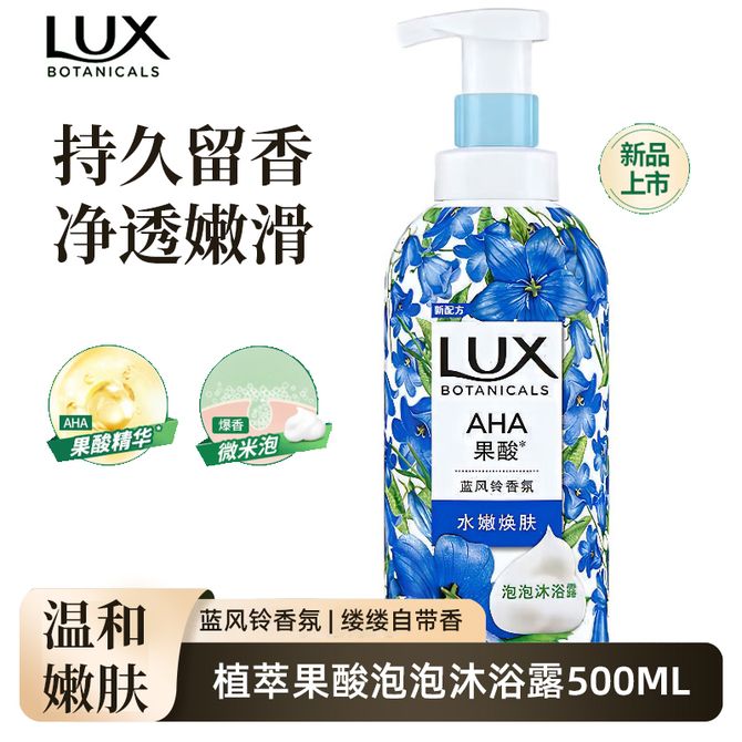 力士/LUX 植萃精油香氛泡泡沐浴露蓝风铃香500ML 持久留香温和嫩肤深层清洁毛孔沐浴露