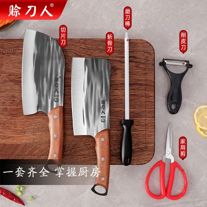 赊刀人 不锈钢材质家用厨房刀具五件套切片刀+斩骨刀+磨刀棒+家用剪+削皮刀刀具套装