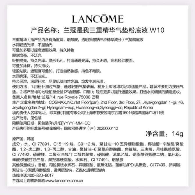 兰蔻 是我水光气垫粉底液 2025 #W10 黄调一白
