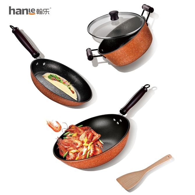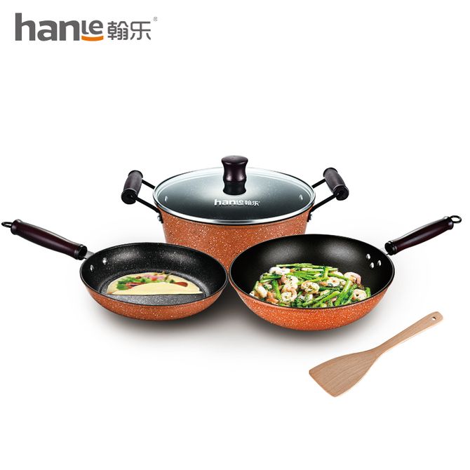 翰乐 精铁麦饭石色不粘锅炒锅平底锅 炒锅+汤锅+煎锅HL-T09 3件套