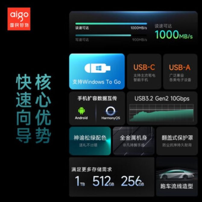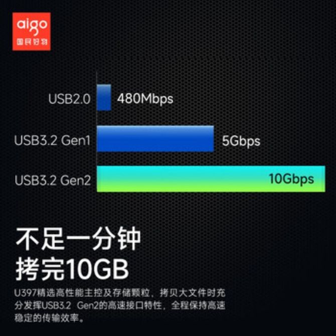 爱国者(aigo) 高速固态U盘U397【512G】Type-C双接口手机电脑两用USB3.2 商务办公大容量移动固态优盘