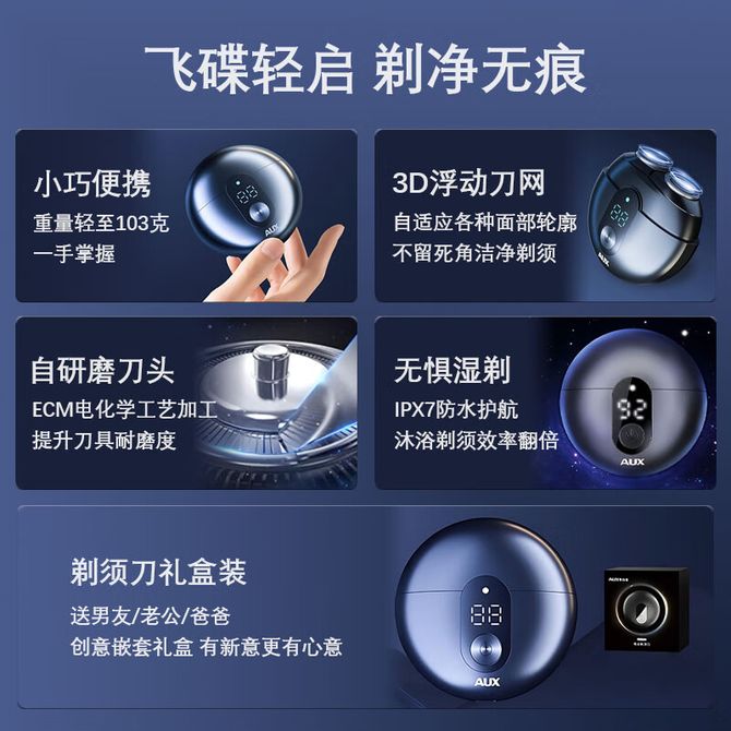 奥克斯/AUX 电动剃须刀 双环弧面刀网设计全身水洗迷你便携剃须刀 AS-288 浮动式双刀头精准贴面 兑换价格 3700 里程 会员卡别 终身白金卡 白金卡 金卡 银卡 普通卡 儿童卡 服务 由 大王电器专卖店 发货并提供售后 颜色: 亚光黑 购买数量: 件 库存件 配送地址: 立即购买 加入购物车 成功添加到购物车 关闭 购物车共有 种商品 总金额为: