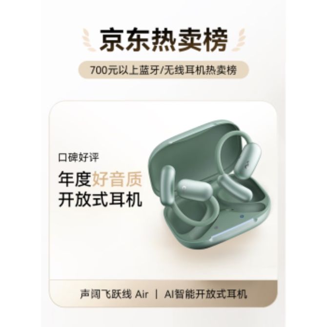 声阔 蓝牙耳机飞跃线Air【松针绿】 开放式自适应空气传导金标音质长续航运动跑步骑行舒固适用苹果华为小米 开放式自适应空气传导金标音质长续航运动跑步骑行舒固适用苹果华为小米 兑换价格 31300 里程 会员卡别 终身白金卡 白金卡 金卡 银卡 普通卡 儿童卡 服务 由 华睿博望 发货并提供售后 颜色: 绿色 购买数量: 件 库存件 配送地址: 立即购买 加入购物车 成功添加到购物车 关闭 购物车共有 种商品 总金额为: 组合销售 产品介绍 产品规格 售后服务 产品咨询 发现好货 雷摄 运动蓝牙耳机无线跑步超长续航待机半入耳降噪高端健身2024新款 BT-03半入耳 1400 里程 华为/Huawei FreeBuds SE 3 无线蓝牙耳机 流光金 6100 里程 纽曼 LY63蓝牙耳机耳夹式骨传导概念开放式不入耳无线运动音乐通话降噪 3400 里程 纽曼(Newmine) 夹耳式蓝牙耳机 超无感佩戴空气感舒适体验 LY63 3400 里程 飞利浦(PHILIPS) 骨传导通话降噪耳夹式真无线开放耳机TAT3469 7000 里程