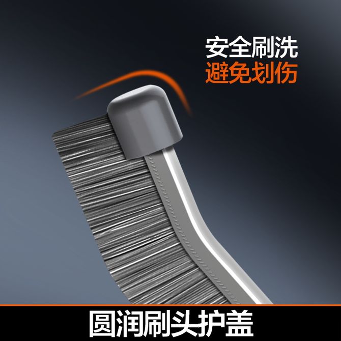 1、扁平刷头,深入刷缝隙; 2、刷毛密集柔韧; 3、20度刷头,沟槽轻松刷; 4、圆润刷头护盖,安全刷洗,避免划伤