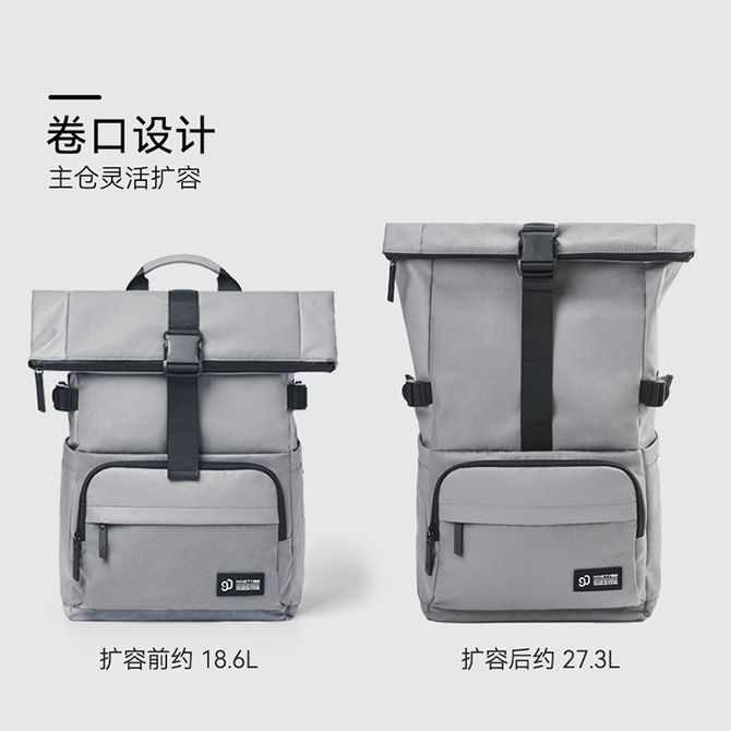 卷口设计主仓灵活扩容,快捷拿取后置拉链直取物品,减压肩带&推车带全方位减负出行