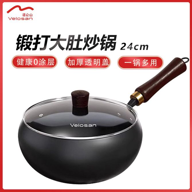温仑山 锻打大肚炒锅 24cm无涂层大肚炖炒锅家用带盖不粘锅炒菜锅
