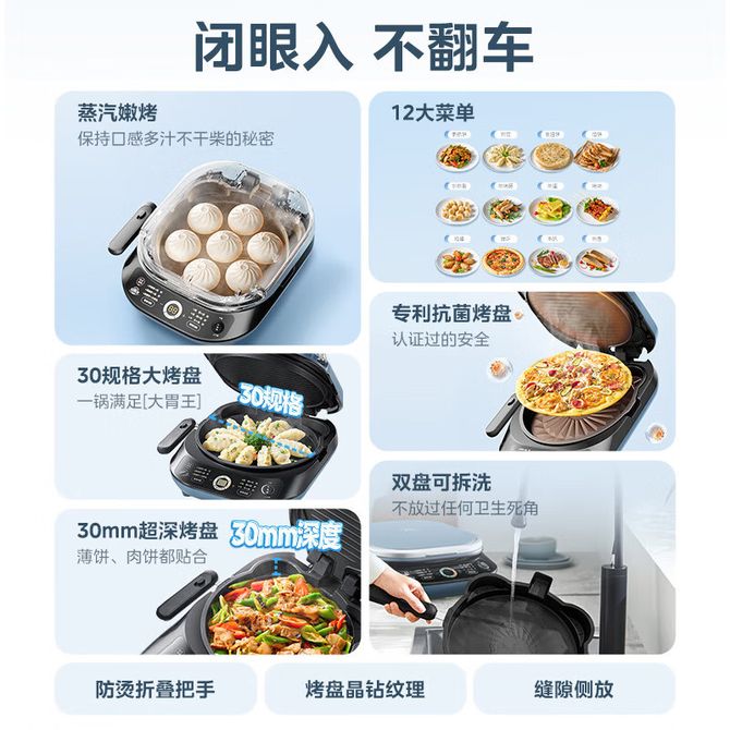 组合销售 产品介绍 产品规格 售后服务 产品咨询 发现好货 苏泊尔(SUPOR)电饼铛家用 双面加热煎饼铛煎烤机三明治机烙饼锅早餐机25mm加深烤盘火力可调JD31A847A 6500 里程 苏泊尔(SUPOR) 电饼铛 自动煎烤机 电火锅多功能 加大加深60mm双加热烙饼 锅面煎饼电饼档 两档火力 JT30A818 5700 里程 苏泊尔(SUPOR)电饼铛家用双面加热电饼档煎烤机烙饼机双面悬浮加热早餐机三明治机JJ30A648-Q 5700 里程 美的(Midea)电饼铛家用智能双面加热煎烤机烙饼机蛋饼机薄饼机煎饼烙饼锅JHN30F 4800 里程 奥克斯 电饼铛家庭用新款双面加热加大尺寸加深烤盘烙饼专用锅自动控温断电煎饼锅早餐机 5200 里程