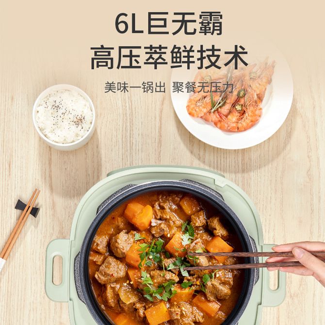 组合销售 产品介绍 产品规格 售后服务 产品咨询 发现好货 苏泊尔(SUPOR)电压力锅 6升大容量 智能触控 球釜双胆 开盖收汁 一键排压 SY-60YC8001Q 高压锅 16900 里程 苏泊尔(SUPOR) 5L电压力锅家用电高压锅双胆高压电饭锅煮饭智能预约 SY-50YC8186 11300 里程 美的/Midea 电压力锅 【一锅双胆】5L全自动家用智能预约 上蒸下煮 不粘双胆煲汤炖肉 YL50Q3-451 10900 里程 美的/Midea 电压力锅 【双胆】5升大容量电饭煲全自动智能饭锅多功能高压锅 24小时智能预约 MY-E523 10400 里程 九阳/Joyoung 电压力锅5L家用电饭锅压力煲电高压锅煮饭锅电饭锅电饭煲全自动智能预约 Y-50C31 11000 里程