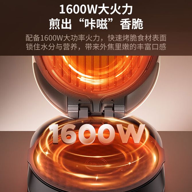 一键拆卸清洗,大直径深烤盘,陶瓷防刮涂层,1600W功率速热,便携防烫电镀把手