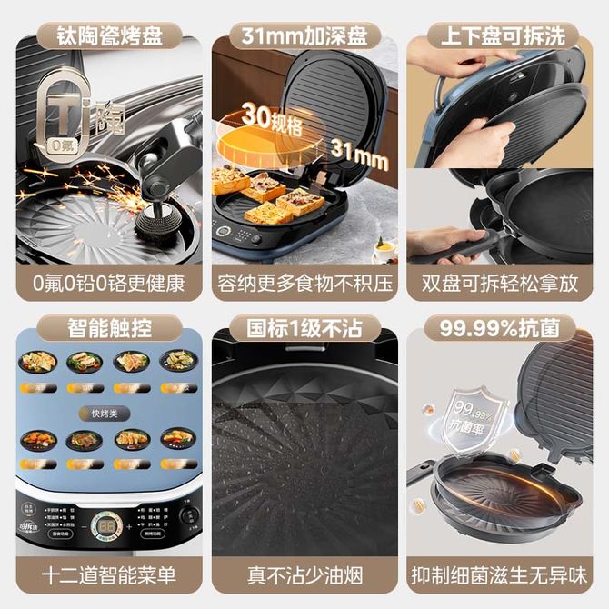 美的/Midea 电饼铛钛陶抗菌烤盘0氟超耐磨三种烹饪模式家用电饼铛煎烤机 三档开合 双盘可拆洗 双盘独立控温 前置式烤盘开关 兑换价格 12200 里程 会员卡别 终身白金卡 白金卡 金卡 银卡 普通卡 儿童卡 服务 由 北京致诚博雅贸易有限公司 发货并提供售后 颜色: 其他 购买数量: 件 库存件 配送地址: 立即购买 加入购物车 成功添加到购物车 关闭 购物车共有 种商品 总金额为: 组合销售 产品介绍 产品规格 售后服务 产品咨询 发现好货 苏泊尔(SUPOR)电饼铛家用 双面加热煎饼铛煎烤机三明治机烙饼锅早餐机25mm加深烤盘火力可调JD31A847A 6500 里程 苏泊尔(SUPOR) 电饼铛 自动煎烤机 电火锅多功能 加大加深60mm双加热烙饼 锅面煎饼电饼档 两档火力 JT30A818 5700 里程 苏泊尔(SUPOR)电饼铛家用双面加热电饼档煎烤机烙饼机双面悬浮加热早餐机三明治机JJ30A648-Q 5700 里程 美的(Midea)电饼铛家用智能双面加热煎烤机烙饼机蛋饼机薄饼机煎饼烙饼锅JHN30F 4800 里程 奥克斯 电饼铛家庭用新款双面加热加大尺寸加深烤盘烙饼专用锅自动控温断电煎饼锅早餐机 5200 里程