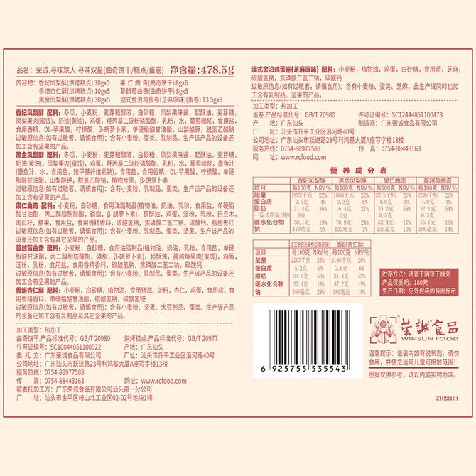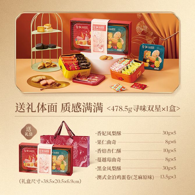 30g香妃凤梨酥x5 8g果仁曲奇x6 10g香焙杏仁酥x5 8g蔓越莓曲奇x5 13.5g澳式金泊鸡蛋卷(芝麻原味)x3 30g黑金凤梨酥x5