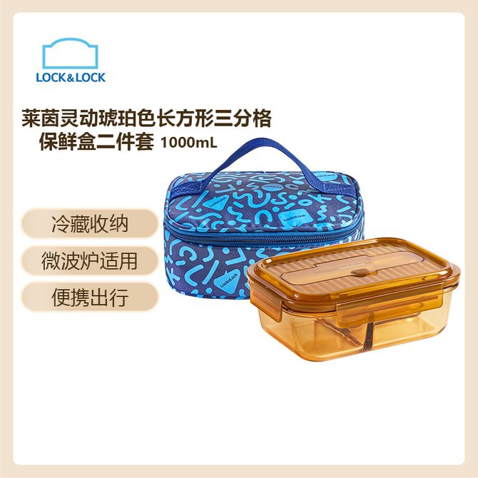 乐扣乐扣 莱茵灵动长方形三分格保鲜盒二件套琥珀色 1000ml 双重密封分隔便当盒饭盒玻璃碗