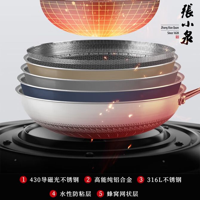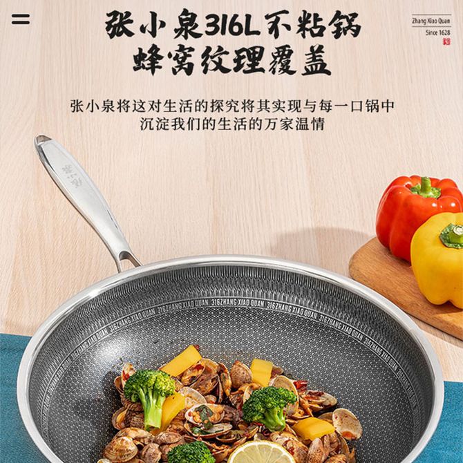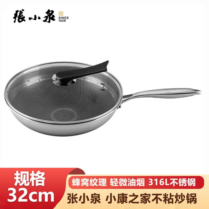 张小泉 316L不锈钢32cm炒锅 蜂窝纹理 轻微油烟易清洗爆炒家用锅具