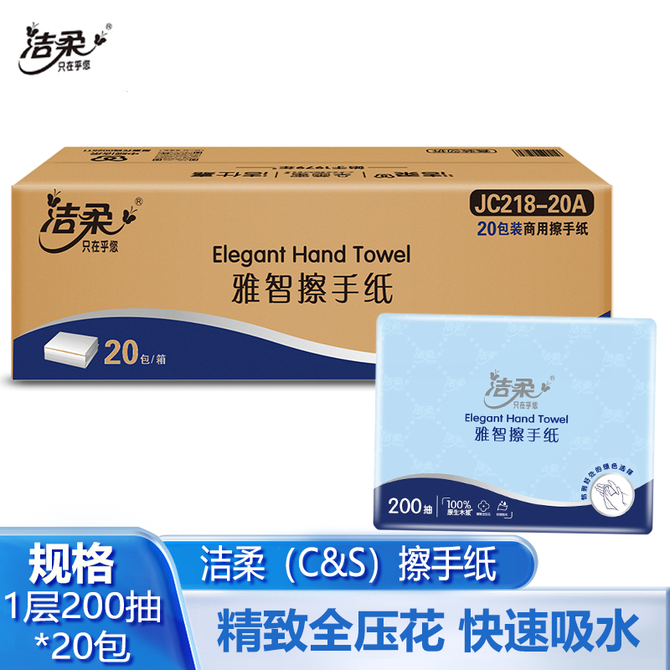 洁柔 家用餐巾纸擦手纸1层200抽*20包高温杀菌不掉屑柔韧亲肤100%原生木浆
