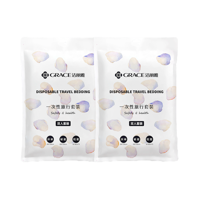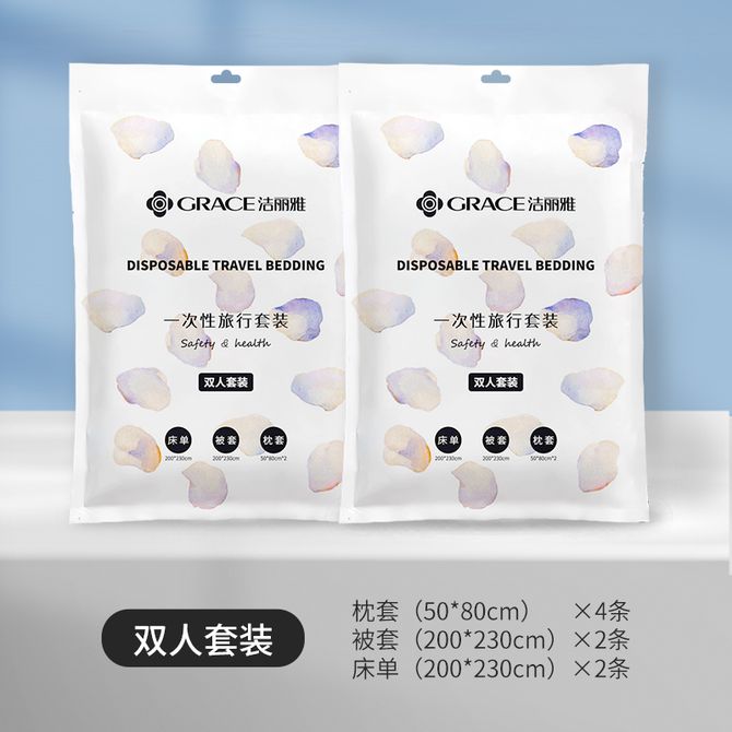 洁丽雅/Grace JA2035旅行一次性床单被套枕套双人四件套装旅游酒店床上用品2包13011513 枕套(50*80)×2条、被套(200*230)×1条、床单(200*230)×1条 型号:JA2035 组合:两包装 材 质:无纺布 规格:枕套(50*80)×2条、被套(200*230)×1条、床单(200*230)×1条 克重:330g 兑换价格 2000 里程 会员卡别 终身白金卡 白金卡 金卡 银卡 普通卡 儿童卡 服务 由 吉时雨居家生活馆 发货并提供售后 被、单尺寸: 200*230cm 颜色: 白色 购买数量: 件 库存件 配送地址: 立即购买 加入购物车 成功添加到购物车 关闭 购物车共有 种商品 总金额为: 组合销售 产品介绍 产品规格 售后服务 产品咨询 发现好货 洁丽雅(Grace)床单 加厚老粗布床单夏季双人被单单件1.5/1.8米床 200*230cm余晖 2900 里程 洁丽雅(Grace)床单 加厚老粗布被单夏季床罩单件1.5/1.8/2米床 230*250cm 余晖 3300 里程 南极人亲肤被套单件-简约牛仔蓝NBT062 2600 里程 京东京造 60支轻奢高支高密贡缎纯色床单 新疆长绒棉 纯棉床罩 床单单件 245*250 5700 里程 洁丽雅(Grace)全棉床单单件 四季纯棉单人学生宿舍被单床罩 格调 1米/1.2米/1.5米床 160*230cm 2900 里程