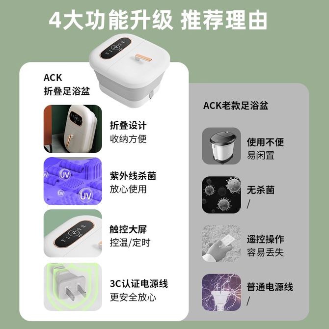 组合销售 产品介绍 产品规格 售后服务 产品咨询 发现好货 小熊/Bear 泡脚桶加热 足浴盆按摩 洗脚盆加热家用脚动按摩送爸爸妈妈父母长辈亲生日礼物礼品母亲节礼物 【恒温速热款】 ZYP-F05Y1 5500 里程 小熊/Bear 泡脚桶 全自动按摩折叠足浴盆洗脚盆 恒温加热足浴桶足疗盆高深桶泡脚盆 7000 里程 康佳/Konka 折叠足浴盆家用足浴盆恒温洗脚盆沐足浴足可折叠便携水电分离泡脚桶 5700 里程 奥克斯 杀菌泡脚桶足浴盆全自动按摩洗脚盆电动加热恒温足疗熏蒸高深桶过膝家用智能元旦节男女友老师礼品 【豪华款】熏蒸泡一体+太极滚轮+足弓针刺 13000 里程 港德 足浴盆按摩泡脚桶加热泡脚盆洗脚盆RD-205 6800 里程