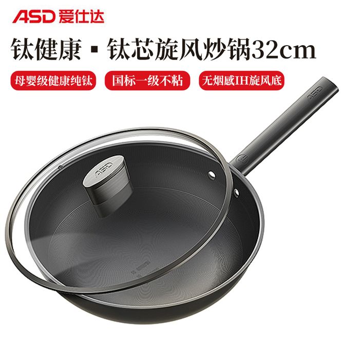 爱仕达/ASD 炒锅 32cm 家用0涂层健康纯钛炒锅厨房炒菜锅平底不粘锅煎锅耐磨易洁