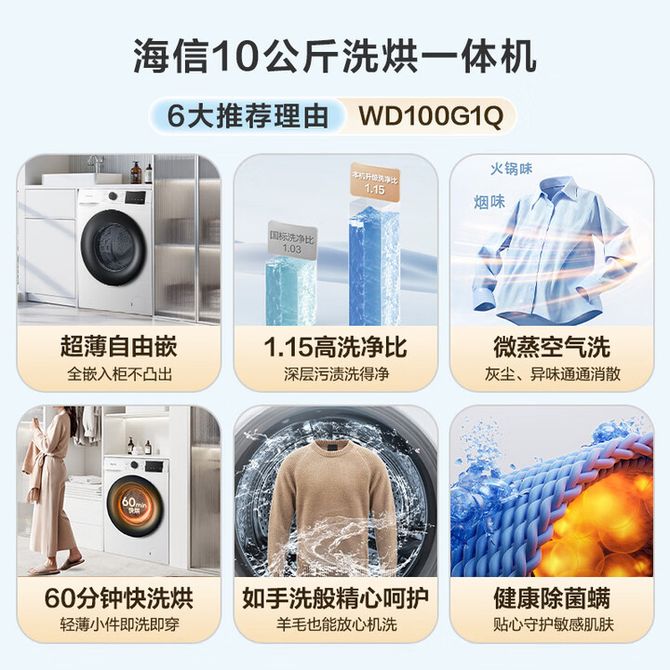 海信/Hisense 滚筒洗烘一体洗衣机 超薄嵌入 高洗净比 蒸汽除螨 专利桶自洁 WD100G1Q 超薄自由嵌 60分钟快洗烘 10公斤洗烘容量 超薄自由嵌 60分钟快洗烘 微蒸空气洗 专利全筒自清洁 兑换价格 134700 里程 会员卡别 终身白金卡 白金卡 金卡 银卡 普通卡 儿童卡 服务 由 存悦商贸 发货并提供售后 洗衣机容量: 10kg 洗衣机产品类型: 洗烘一体 颜色: 白色 购买数量: 件 库存件 配送地址: 立即购买 加入购物车 成功添加到购物车 关闭 购物车共有 种商品 总金额为: 组合销售 产品介绍 产品规格 售后服务 产品咨询 发现好货 小熊/Bear 迷你洗衣机 XYJ-C05V5 8200 里程 小熊/Bear 内衣裤洗衣机 双重除菌3档可选 XYJ-C05V5 8000 里程 美的/Midea 0.5kg迷你洗衣机 内衣裤洗衣机小型 迷你洗衣机 高温除菌螨 轻音洗 MNB5VCAW0E 28300 里程 OIDIRE 迷你洗衣机 双桶便携清洗机 半自动小型清洗杯婴儿衣物迷你清洗机 出差旅行宿舍用迷你洗衣机 ODI-XYJ16 10000 里程 大宇 折叠迷你洗衣机便携旅游内衣袜子小型半自动清洗机 DYXY-ZD13 13000 里程