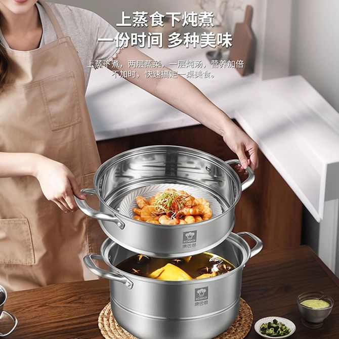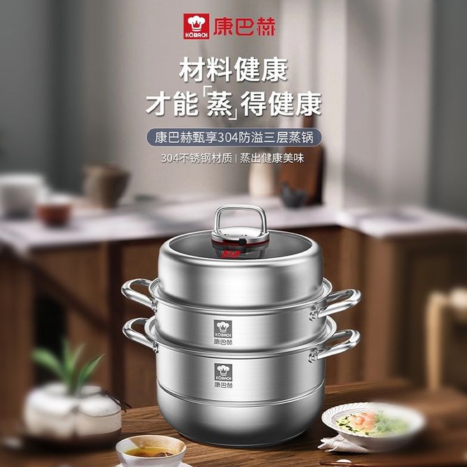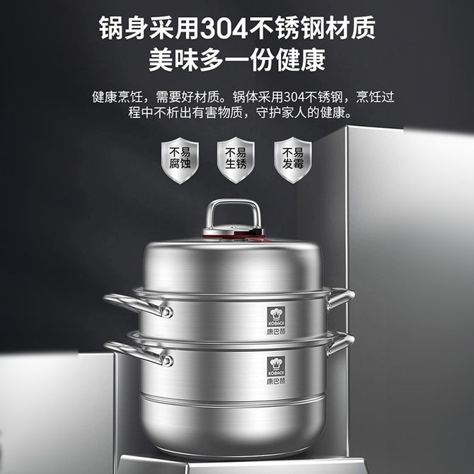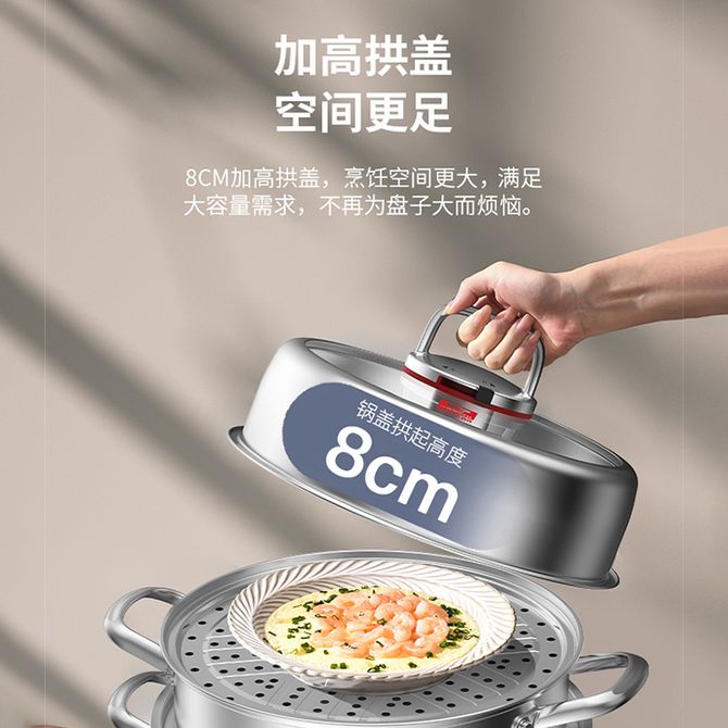 304不锈钢材质,上蒸下煮,加高拱盖,蒸汽热循环设计,三层大容量,复合锅底
