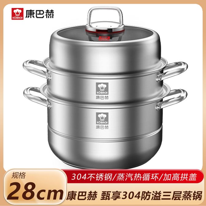 康巴赫 甄享304防溢三层蒸锅28cm大容量家用蒸笼蒸锅蒸包子馒头蒸鱼煮汤锅复合锅底 不挑炉灶