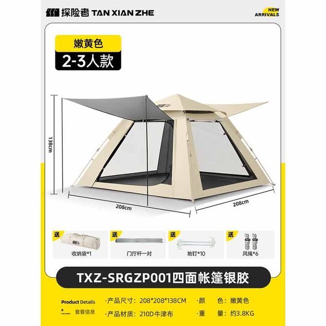 探险者(TAN XIAN ZHE) 帐篷户外便携式折叠露营装备全自动帐篷加厚防晒野营 探险者山如故系列故山户外帐篷 兑换价格 13000 里程 会员卡别 终身白金卡 白金卡 金卡 银卡 普通卡 儿童卡 服务 由 亿宇安百户外专营店 发货并提供售后 颜色: 其他 购买数量: 件 库存件 配送地址: 立即购买 加入购物车 成功添加到购物车 关闭 购物车共有 种商品 总金额为: 组合销售 产品介绍 产品规格 售后服务 产品咨询 发现好货 北山狼/BSWolf 户外月亮椅露营折叠椅便携式野餐沙滩休闲躺椅 卡其色-成人款 2600 里程 徽羚羊 帐篷防雨布天幕户外遮阳超轻便携大凉棚野露营防雨遮阳棚 300*295CM 5000 里程 创悦(CREAJOY)便携式帐篷 2-3人室内外露营遮阳帐篷 200*150*115cm CY-5800蓝色 5300 里程 探险者(TAN XIAN ZHE) 帐篷 户外便携式折叠露营装备全自动帐篷 3-4人银胶速开帐篷 (200*145*120cm) 8500 里程 创悦(CREAJOY)全自动帐篷 2-3人野营露营免安装速开帐篷 200*150*135cm CY-5905A 绿色 8700 里程