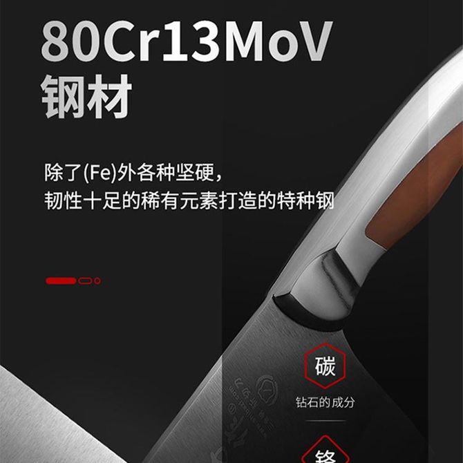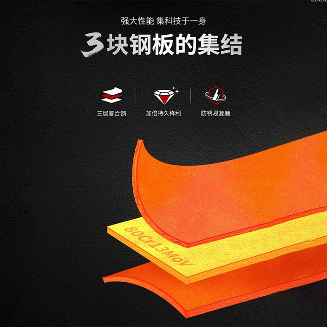 三层复合钢,加倍持久锋利,防锈易复磨,刀背圆滑不割手,一体成型刀柄