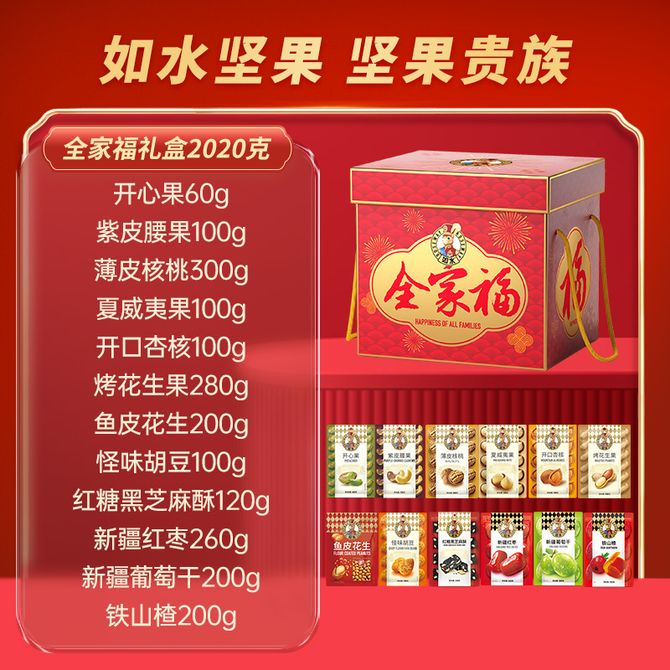 如水 坚果礼盒 全家福礼盒2020g 过年过节送礼送长辈首选 坚果礼盒 全家福礼盒2020g 兑换价格 6500 里程 会员卡别 终身白金卡 白金卡 金卡 银卡 普通卡 儿童卡 服务 由 多宝商城 发货并提供售后 规格: 礼盒 购买数量: 件 库存件 配送地址: 立即购买 加入购物车 成功添加到购物车 关闭 购物车共有 种商品 总金额为: 组合销售 产品介绍 产品规格 售后服务 产品咨询 发现好货 西域美农 新疆薄皮核桃500g/袋 新疆特产原味 薄皮核桃 1300 里程 西域美农 烘焙腰果200g 坚果特产 休闲零食 带皮腰果仁 1600 里程 味滋源 紫皮腰果2袋装 每袋100g 1100 里程 沃隆每日坚果(A)175g盒装 1700 里程 百草味 坚果炒货夏威夷果100g*1袋 1100 里程