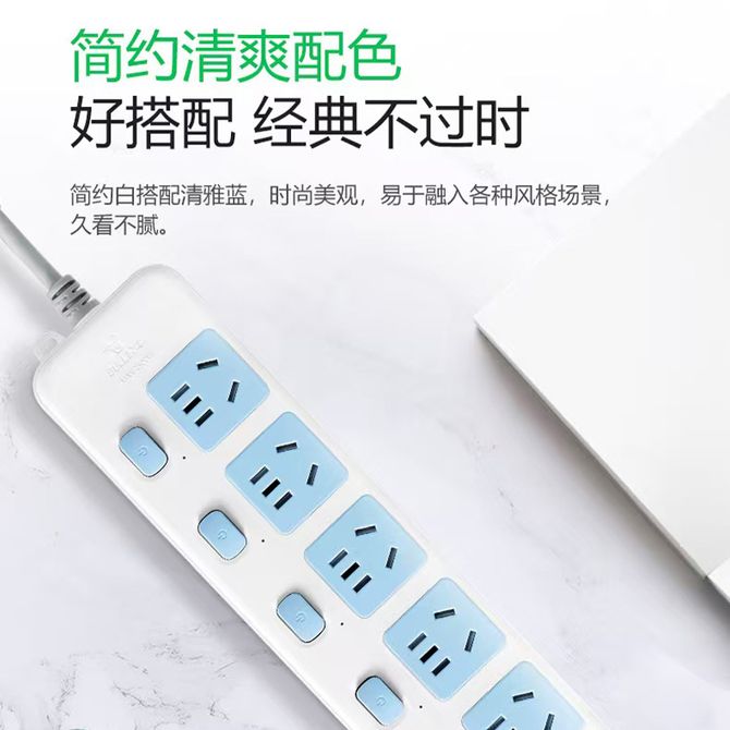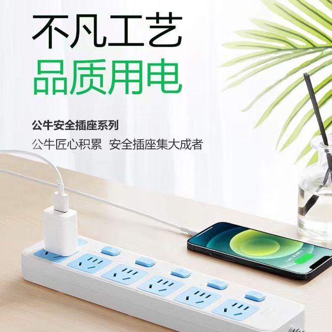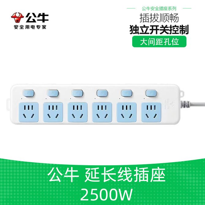 公牛(BULL) 基础蓝白款多孔长线多功能电插板分控开关拖线板带儿童保护门排插接线板