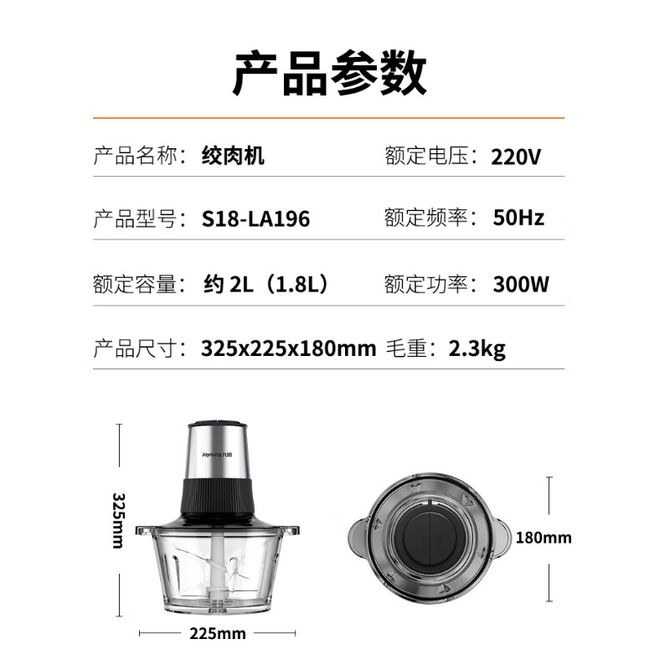 九阳/Joyoung 绞肉机家用 绞馅机 碎肉机 电动多功能搅拌肉馅机 约2L大容量 S18-LA196 SYL