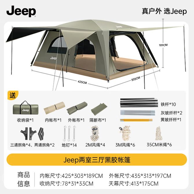Jeep 多空间两室三厅露营野营自动速开天幕帐篷 内帐尺寸:425*303*189CM、外帐尺寸:435*313*197CM、收纳尺寸:78*31*33CM、天幕尺寸:413*175CM 兑换价格 43500 里程 会员卡别 终身白金卡 白金卡 金卡 银卡 普通卡 儿童卡 服务 由 至恩户外运动专营店 发货并提供售后 颜色: 绿色 购买数量: 件 库存件 配送地址: 立即购买 加入购物车 成功添加到购物车 关闭 购物车共有 种商品 总金额为: