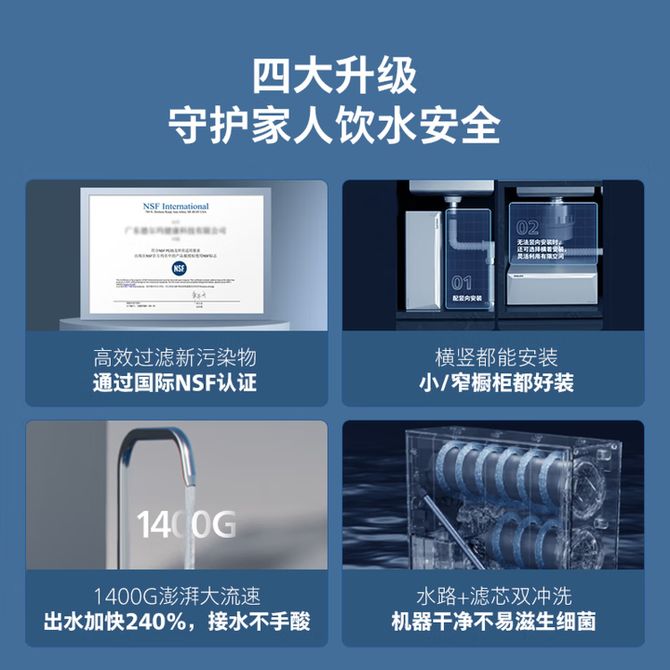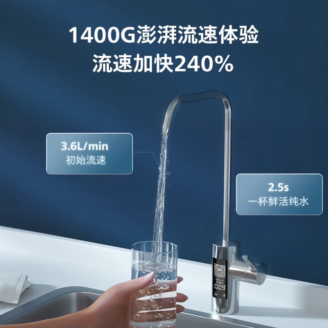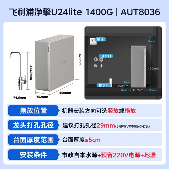 飞利浦/Philips AUT8036 家用净水器 净擎U24lite 1400G通量 5年RO反渗透滤芯 3.6L/min厨下pfas净水器