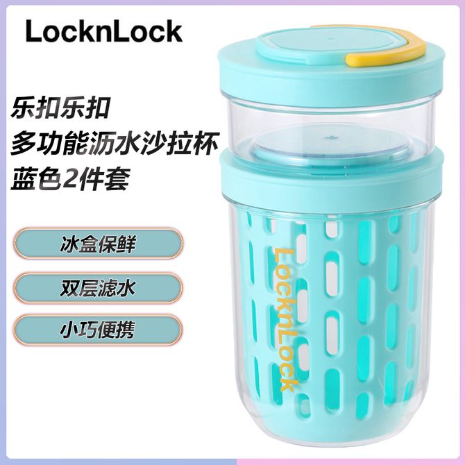 乐扣乐扣 多功能沥水沙拉杯蓝色2件套650ml+200ml 沥水设计不沾湿野餐通勤保鲜盒沙拉杯