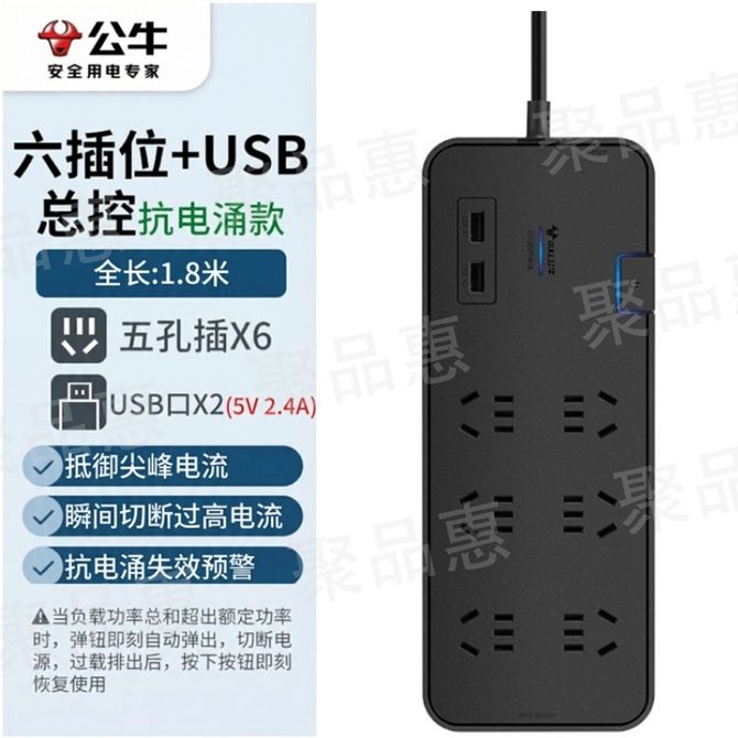 公牛(BULL) 安全抗电涌插座 带USB充电接口拖线板 新国标超功率保护 插线板接线板6插位 超功率保护一键恢复 抵御尖峰电流 稳定的抗电涌 瞬间切断过高电流 兑换价格 6500 里程 会员卡别 终身白金卡 白金卡 金卡 银卡 普通卡 儿童卡 服务 由 聚品惠家电生活馆 发货并提供售后 插排线: 有线 插位: 6插位 购买数量: 件 库存件 配送地址: 立即购买 加入购物车 成功添加到购物车 关闭 购物车共有 种商品 总金额为: