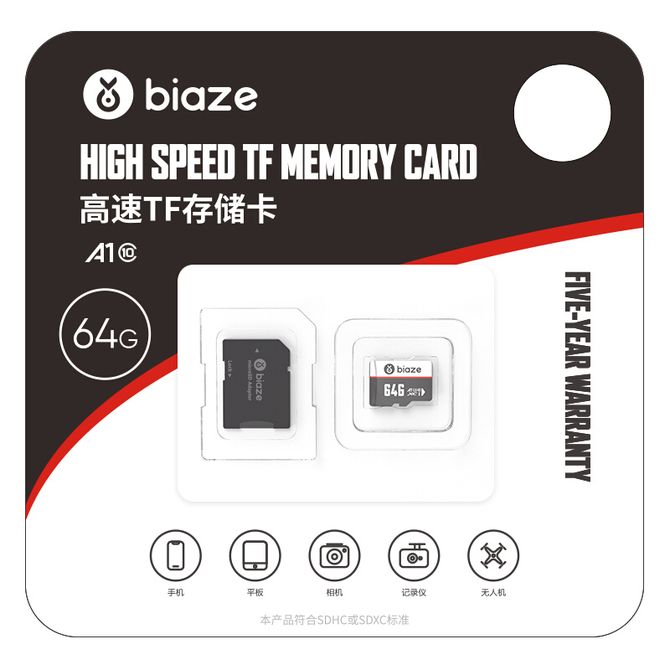毕亚兹/Biaze 64GB TF(Micro SD)存储卡 行车记录仪&安防监控专用 高度耐用 家庭监控内存卡