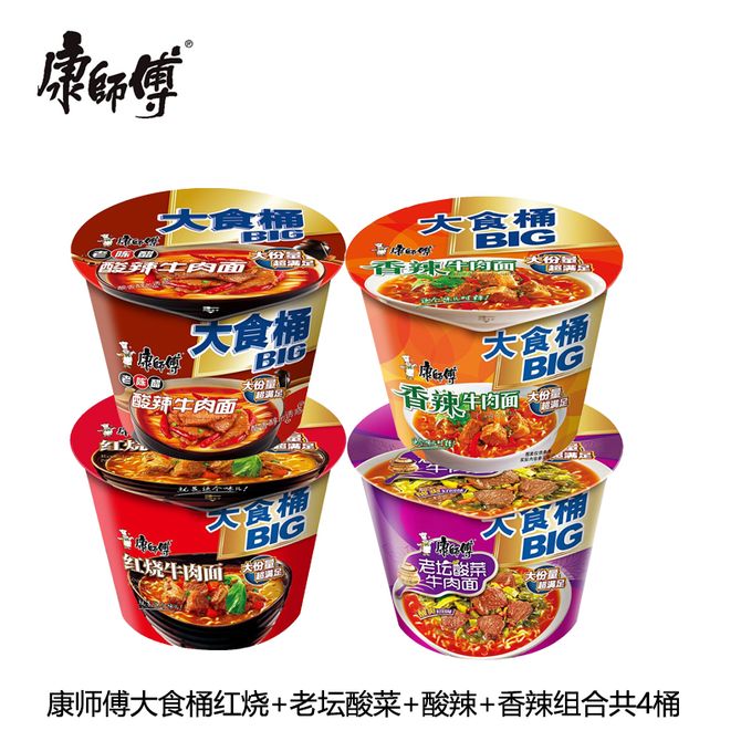 康师傅方便面大食桶红烧+老坛酸菜+酸辣+香辣四种口味共4桶 桶泡面速食面即食面代餐食品