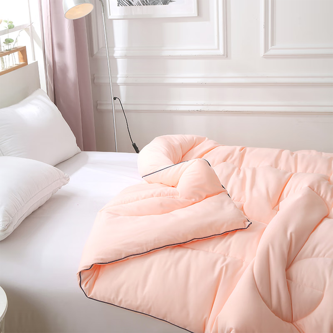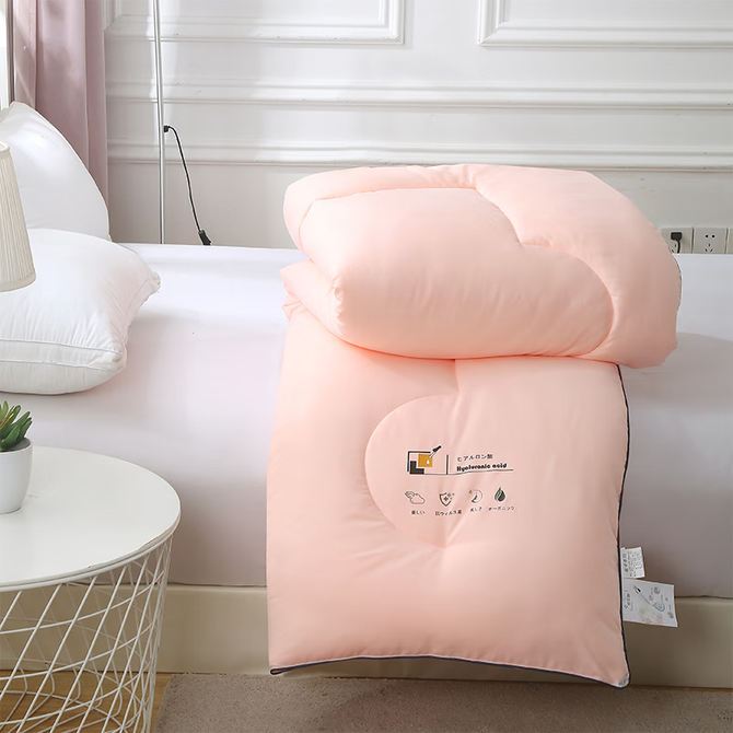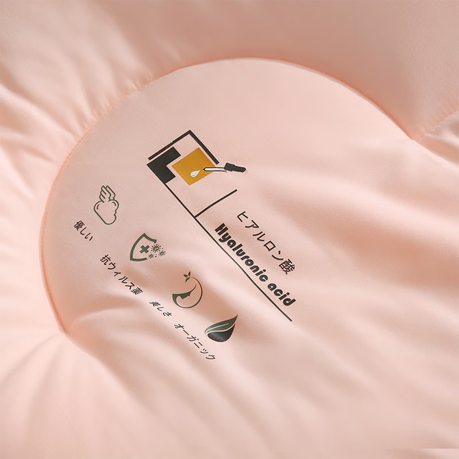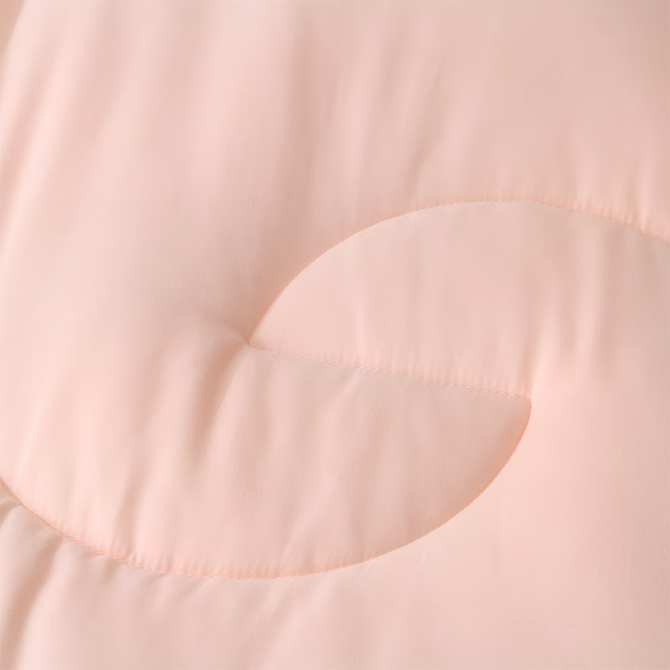 优质玻尿酸磨毛面料,内填充整张超柔羽丝棉,经抗菌处理,吸湿保暖,透气性强。内置聚酯纤维不易结板,回弹性强,交叉绗缝不易滑动。回环包边工艺,保护边缘耐磨耐用。