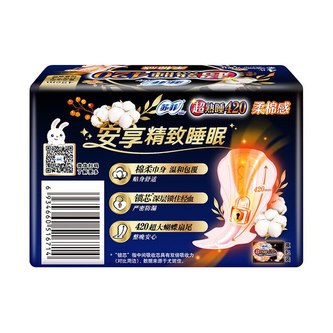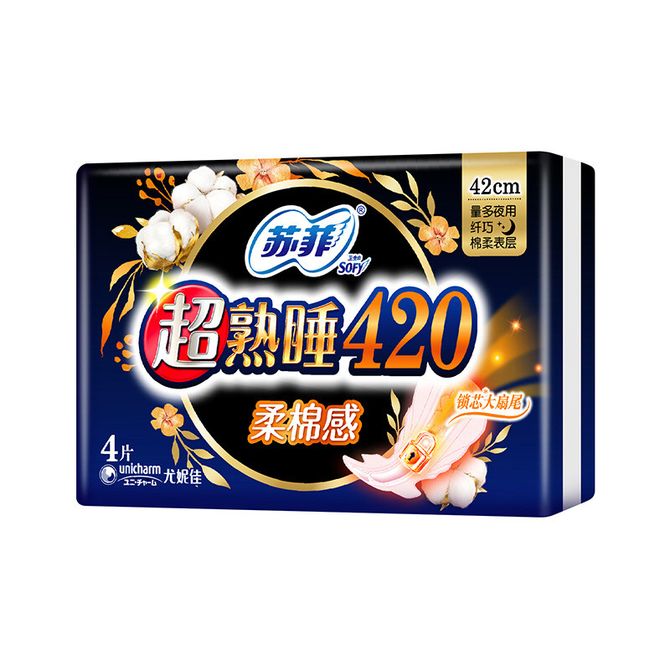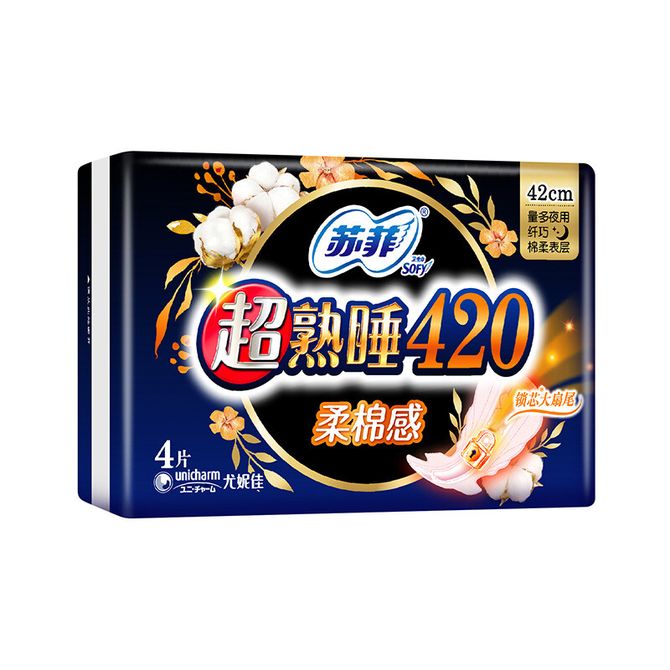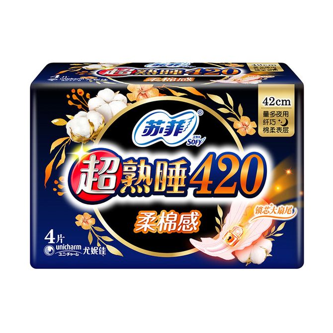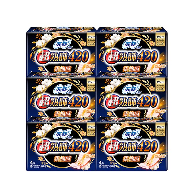 苏菲Sofy 超熟睡 柔棉感 超长夜用卫生巾420mm 4片*6包 加大尾扇量多防渗漏安睡姨妈巾