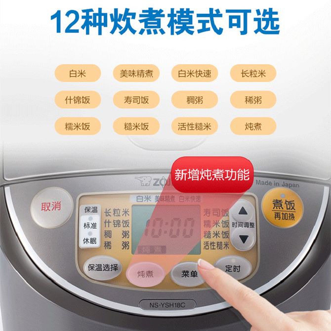 象印ZOJIRUSHI 5L炖煮功能微电脑电饭煲日本进口电饭锅 预约定时智能厨房多功能煮饭煮粥家用电器NS-YSH18C 原装进口,炖煮功能,5升容量,米饭炊煮功能,黑金刚圆形厚锅,可拆洗内盖,音乐告知,蜂巢式内盖 兑换价格 95700 里程 会员卡别 终身白金卡 白金卡 金卡 银卡 普通卡 儿童卡 商品已下架 1. 请联系卖家咨询 2. 逛逛万象盛世电器专营店选择其他商品 组合销售 产品介绍 产品规格 售后服务 产品咨询 发现好货 苏泊尔(SUPOR) 电饭煲电饭锅4L大容量 不粘内胆4-6个人前置大屏面板24小时预约上蒸下煮多功能家用智能SF40FC0063 8300 里程 奥克斯/AUX 电饭煲3L电饭锅 2-3人小型预约智能电饭煲VK-309F2 5100 里程 苏泊尔(SUPOR) 迷你电饭煲家用电饭锅2-3人3L小容量蓝钻不粘内胆快煮饭功能智能预约小型多功能SF30FC0187 6100 里程 美菱/MELNG 电饭煲3L触控式预约定时MF-LC3005 4400 里程 苏泊尔(SUPOR) 煮饭煮粥智能预约多功能一锅多用小型微压电饭锅30FC0187 7200 里程